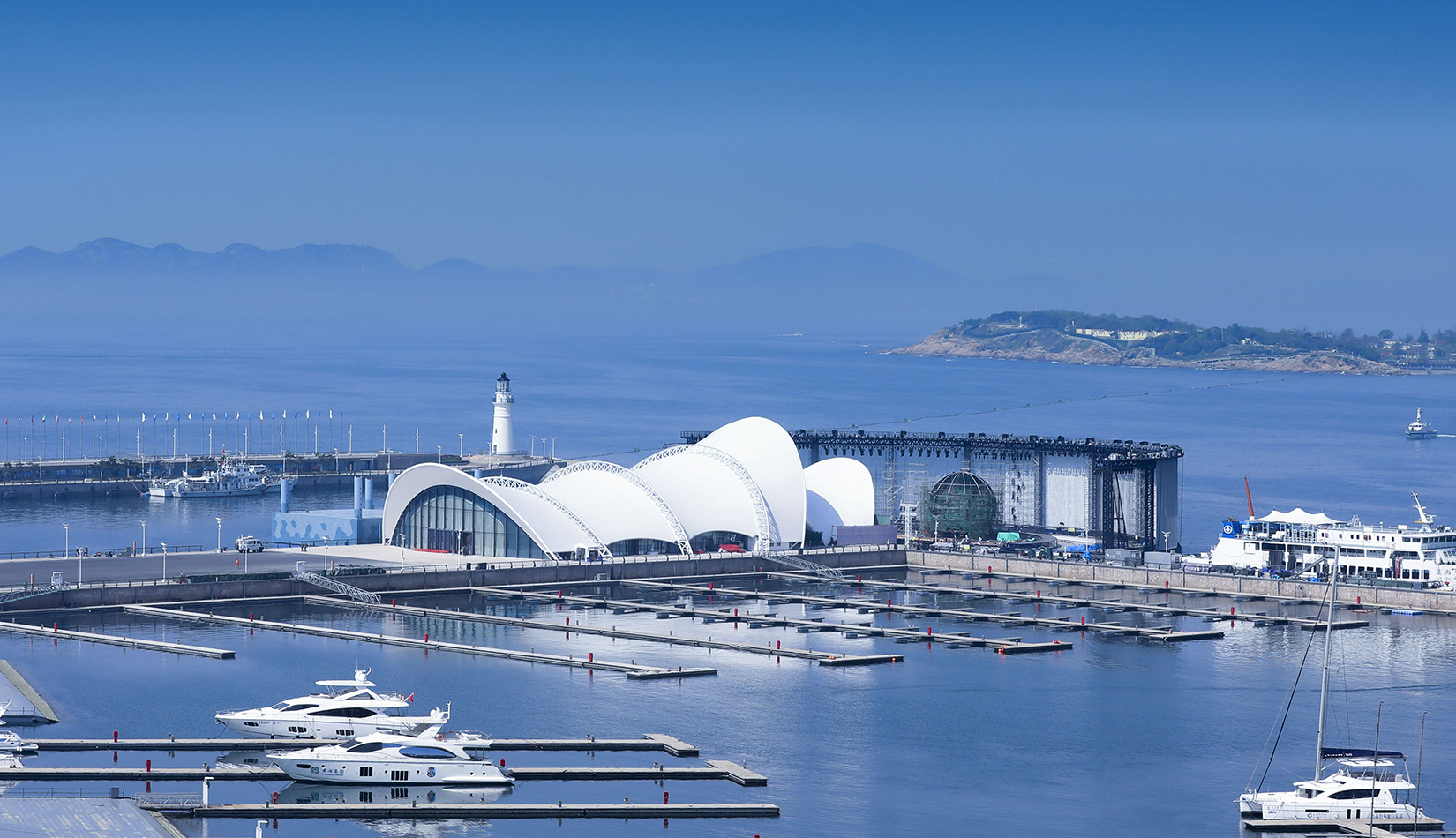 本項目在保留原有建筑主體結(jié)構(gòu)的基礎(chǔ)上,結(jié)合本次會議活動的相關(guān)需求,對其規(guī)模、形象、功能進(jìn)行改造提升。主題材料采用輕盈的鋼結(jié)構(gòu)與膜結(jié)構(gòu),造型宛如海浪中靈動的風(fēng)帆,彰顯青島這座海洋名稱、帆船之都的獨特魅力。