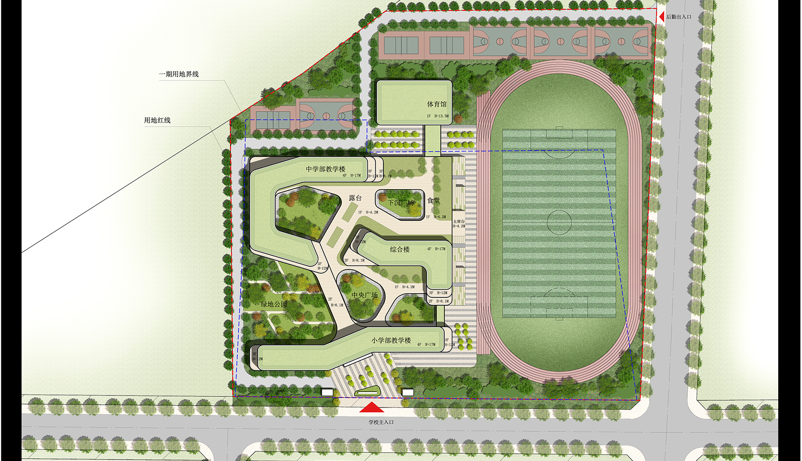 充滿綠化的連續(xù)平臺(tái)接通各教學(xué)樓,在東西南北方向形成內(nèi)院,由西向東側(cè)延伸,與操場(chǎng)融為一體,提供了良好的視覺(jué)穿透性。建筑風(fēng)格現(xiàn)代富有動(dòng)感,線條流暢,形成強(qiáng)烈的可識(shí)別性。