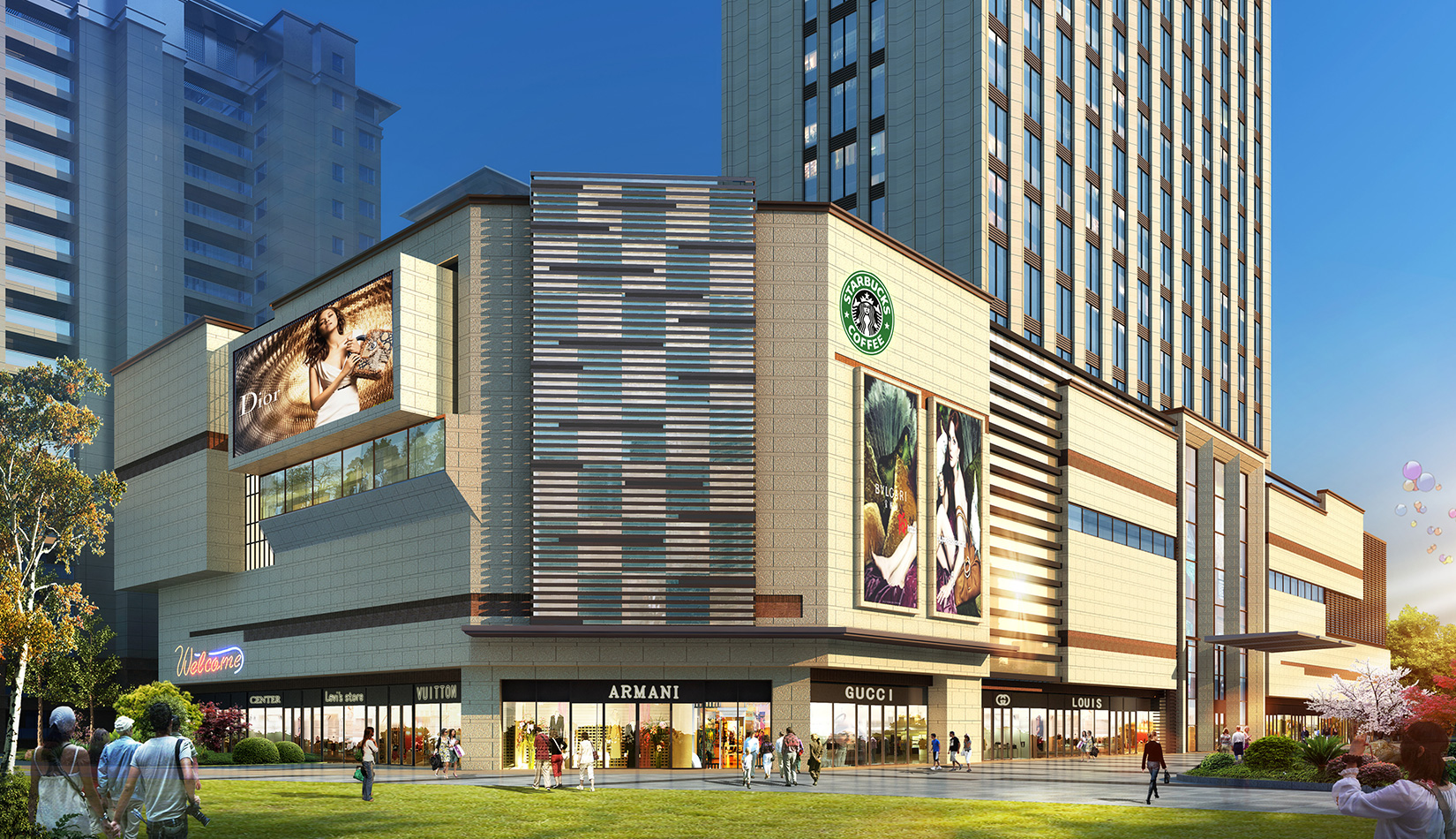 頂部處理上結(jié)合現(xiàn)代化設(shè)計元素和表現(xiàn)手法,豐富建筑體量,力求簡練現(xiàn)代、色彩時尚,使之充滿活力和昭示性效果