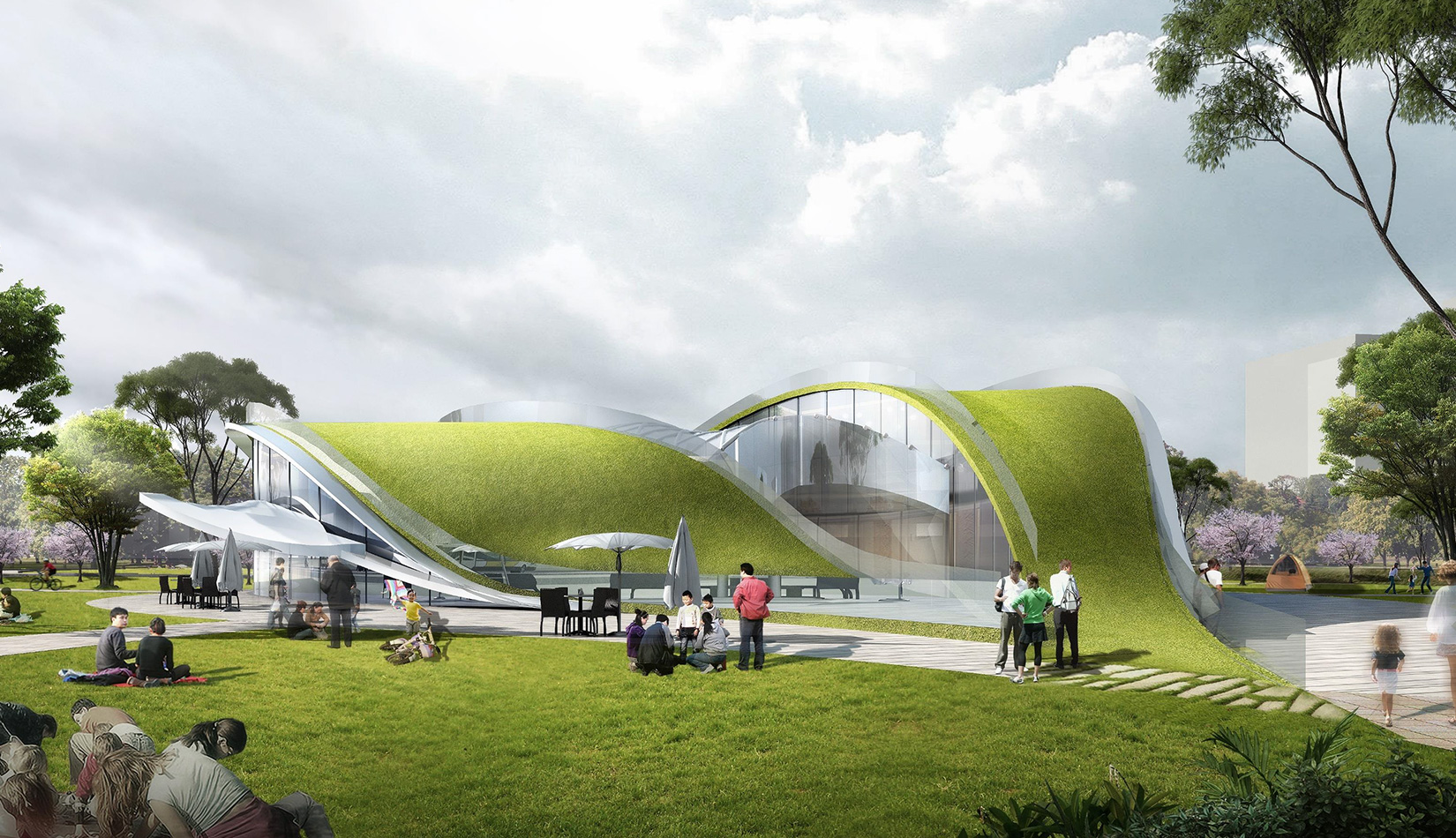 該項(xiàng)目基地位于濱河公園內(nèi),目標(biāo)要將博物館打造成一個(gè)生態(tài)建筑,建筑能與環(huán)境有機(jī)融合。在這一理念下,將博物館設(shè)計(jì)為樹(shù)葉形,建筑猶如一片樹(shù)葉飄落在公園內(nèi),以此體現(xiàn)建筑與環(huán)境的融合。將樹(shù)葉形建筑設(shè)計(jì)為覆土建筑,最大程度還原基地一片綠色,以此呼應(yīng)李村大集的“還原”內(nèi)涵。通過(guò)設(shè)計(jì)兩個(gè)曲線形體相互交融形成建筑的最終體量,以此體現(xiàn)相逢意蘊(yùn),呼應(yīng)李村大集的“相逢”內(nèi)涵。