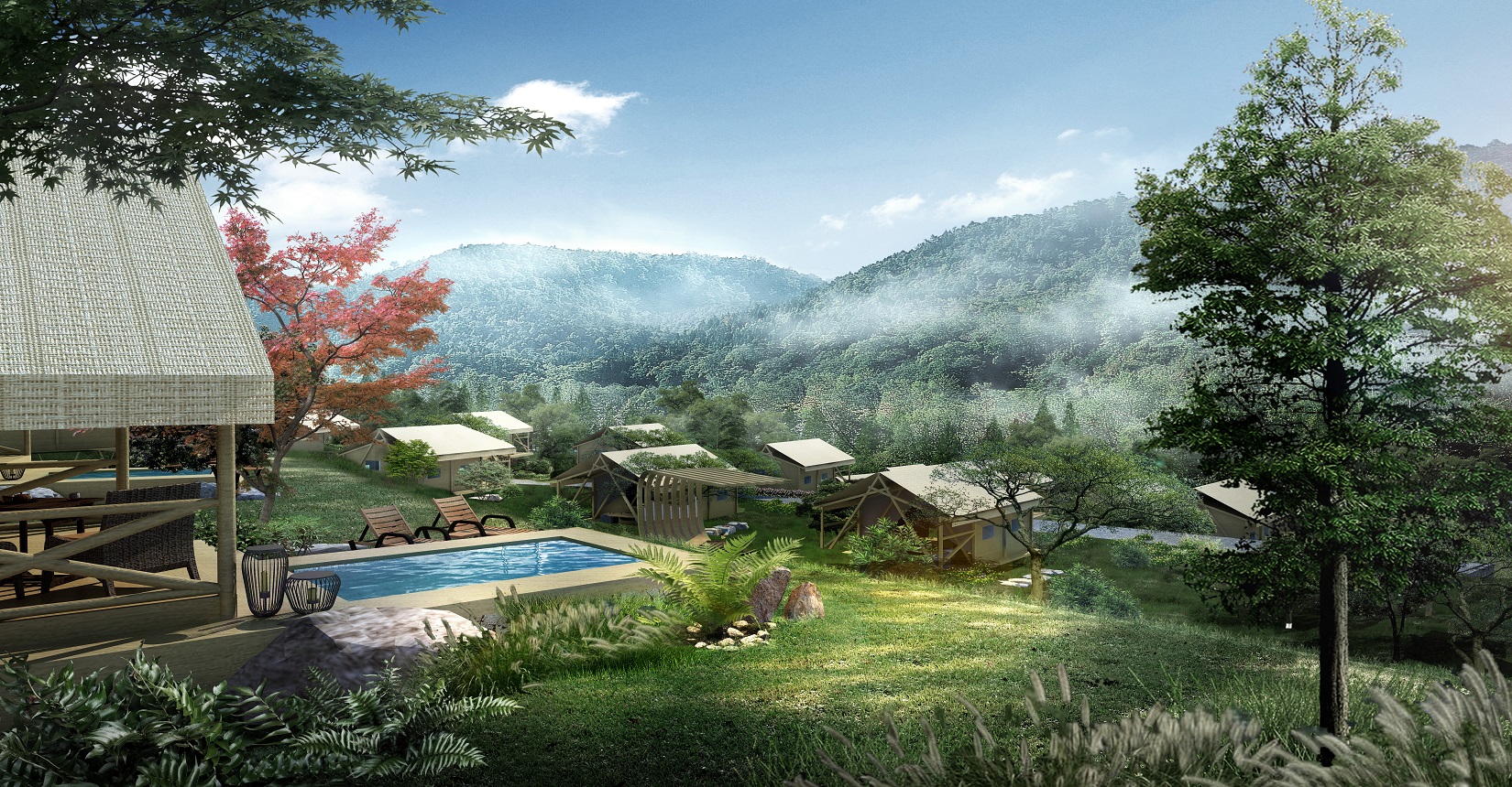 本項目的定位為自然、野奢的景觀風格。對于野奢度假酒店景觀環(huán)境設計遵從“野”“奢”兩點,融入荒野生態(tài)的設計理念,又要與場地相融合、與原生態(tài)相映、與當?shù)氐拿袼罪L情相交匯,突出當?shù)氐奈幕黝},強調高品質的自然、野奢度假,從而打造出一個具備個性與特色,使游客能夠享受到自然野趣體驗的景觀環(huán)境。